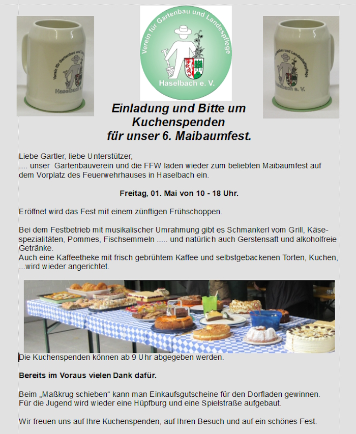 Die Mitglieder und Haselbacher Bürger werden um eine zahlreiche Teilnahme gebeten.