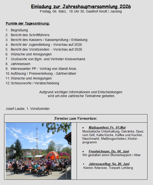 Es wird auch in diesem Jahr wieder ein Maibaum mit zwei geschmückten Kränzen und „Christbäumchen“ aufgestellt.