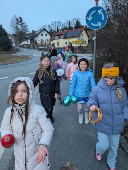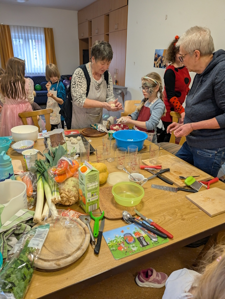 Barbara hat Scones mit den Kindern gebacken, dann haben wir eine Gemüsesuppe vorbereitet. Während diese gekocht hat, haben wir einen kleinen Faschingsumzug gemacht und Luftballons an unseren Gartenzaun gehängt.