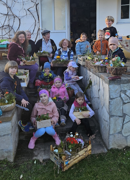 am Dorfbrunnen und im Lehrgarten.