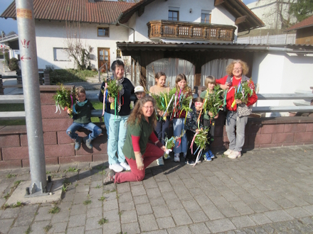 10 Kinder und 9 Erwachsene beteiligten sich in diesem Jahr an unserer Palmbuschen – Aktion. Mit Haselnussstäben, Äpfel, Palmkätzchen, Buchsbaum- und Thujenschnitt und auch mit bunten Bändern gestaltete sich jeder seinen eigenen Palmbuschen. Es war ein rühriges werkeln und schaffen und am Schluss konnte dann jeder seinen Buschen mit nach Hause nehmen. Am Palmsonntag - erfolgte dann die Weihe unter vielen Kirchenbesuchern vor der Hofmarkkapelle.