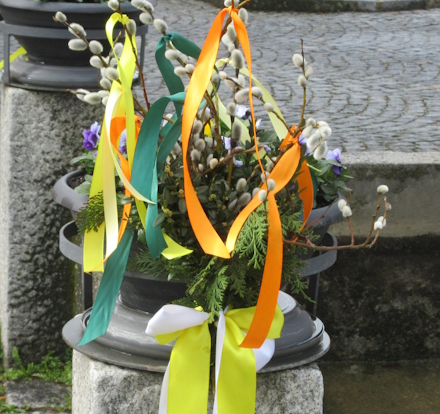 Es wurden auch noch 4 spezielle Palmbuschen für die Osterdekoration des Dorfbrunnens mit angefertigt, die dann mit den Osterschleifen am Brunnen befestigt wurden.